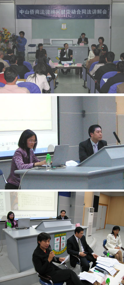 《劳动合同法》即将于2008年1月1日开始实施。12月27日下午,本律师事务所应中山侨资企业商会的邀请,会同千里行、国融两家律师事务所的律师在中港英文学校开设专题讲解会,为60多名侨资企业代表上了一堂《劳动合同法》讲解课。讲解会由张翅律师主持,张文华律师及其他两位律师一起围绕《劳动合同法》实施后,企业如何化解风险?如何依法用工?怎样构建和谐的劳动关系等问题进行了精辟的阐释,并现场互动为企业释疑解惑,就企业在经营管理过程中遇到的各种问题进行交流和探讨。我们希望通过此次讲解会能够为中山的侨资企业合法用工、降低经营风险提供帮助。