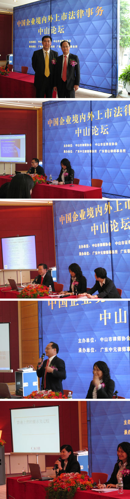 2008年3月28日,由中山市律师协会、中山市证券业协会主办,广东中元律师事务所与广东香山律师事务所承办的中国企业境内外上市法律事务中山论坛在中山市博爱六路帝璟东方接待大厅举行。中山公用科技股份有限公司、中顺纸业集团有限公司、中山市宏俊无纺布有限公司等几十家企业及中山市的兄弟律师事务所参加了此次活动。