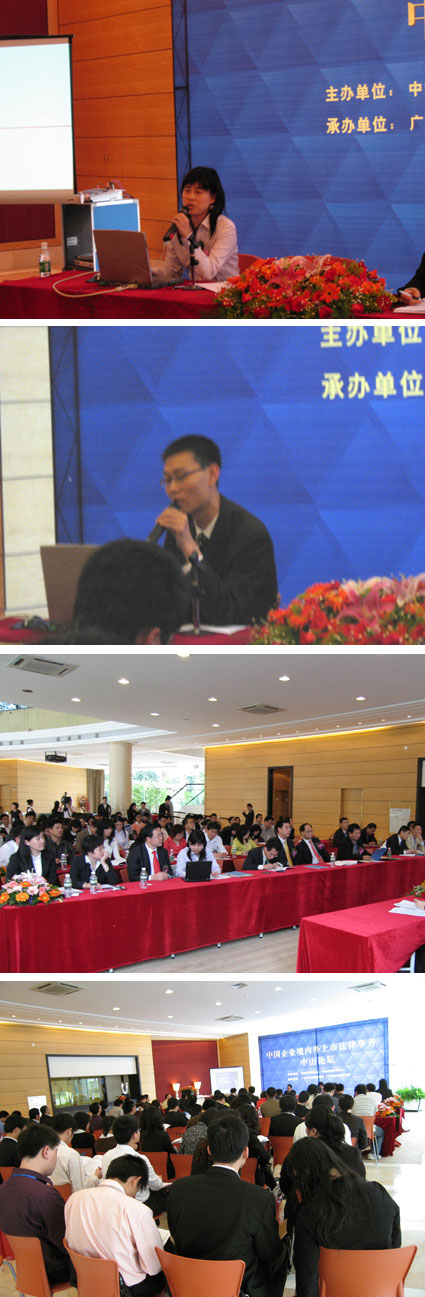 论坛以“服务中国企业境内外上市”为主题,通过对企业国内A股上市及海外上市包括在香港、新加坡、美国等地上市法律法规及操作实务的介绍、比较,为强势推进中国企业境内外上市,充分发挥我国资本市场的融资功能营造了激励氛围。论坛主讲嘉宾有香港胡百全律师事务所林国明律师、香港时富证券有限公司赵珊女士、香港中银国际证券有限责任公司杨晓青女士、美国昆士兄弟证券公司江海旋先生、JMJ安格斯资本有限公司方伟忠先生、广东恒益律师事务所黄卫律师。