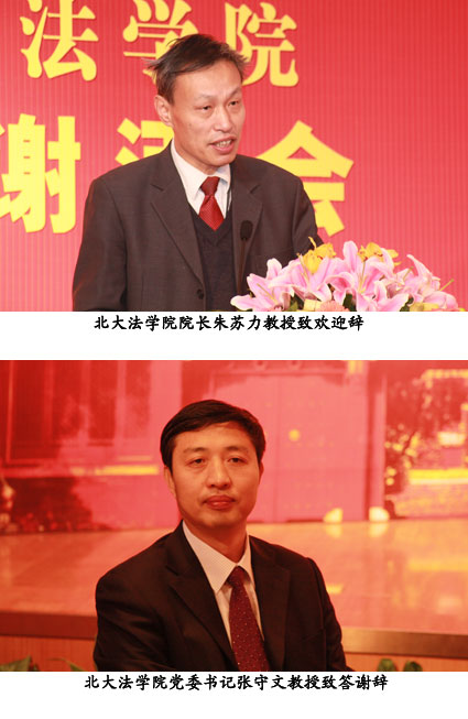 酒会上,北大法学院院长朱苏力教授做了轻松诙谐的讲话,答谢了所有支持北大法学院的单位、同行,对本年度教研工作和学生工作做了汇报总结,并顺便欢迎贺卫方老师重归北大,引起现场数次欢笑和热烈的掌声。